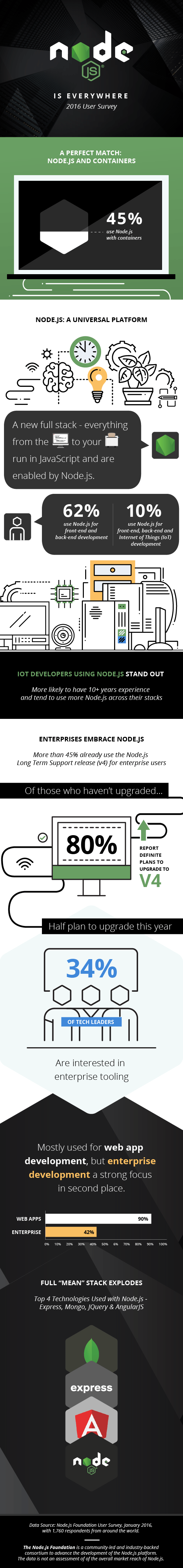 With over 3.5 million users and an annual growth rate of 100 percent, Node.js is emerging as a universal platform used for web applications, IoT, and enterprise. The Node.js User Survey report features insights on emerging trends happening in this massive community that serves as a leading indicator on trends like microservices architectures, real-time web applications, Internet of Things (IoT). The report paints a detailed picture of the technologies that are being used, in particular, with Node.js in production and language preferences (current and future) for front end, back end and IoT developers.